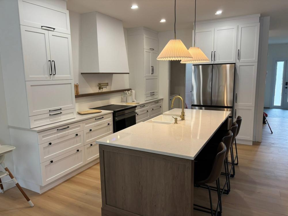 Conception, fabrication et installation complète de vos armoires, îlots, rangements et finitions.