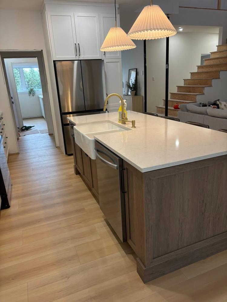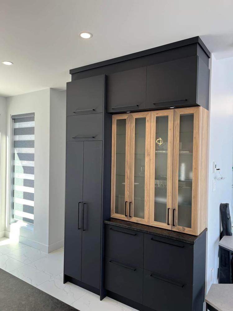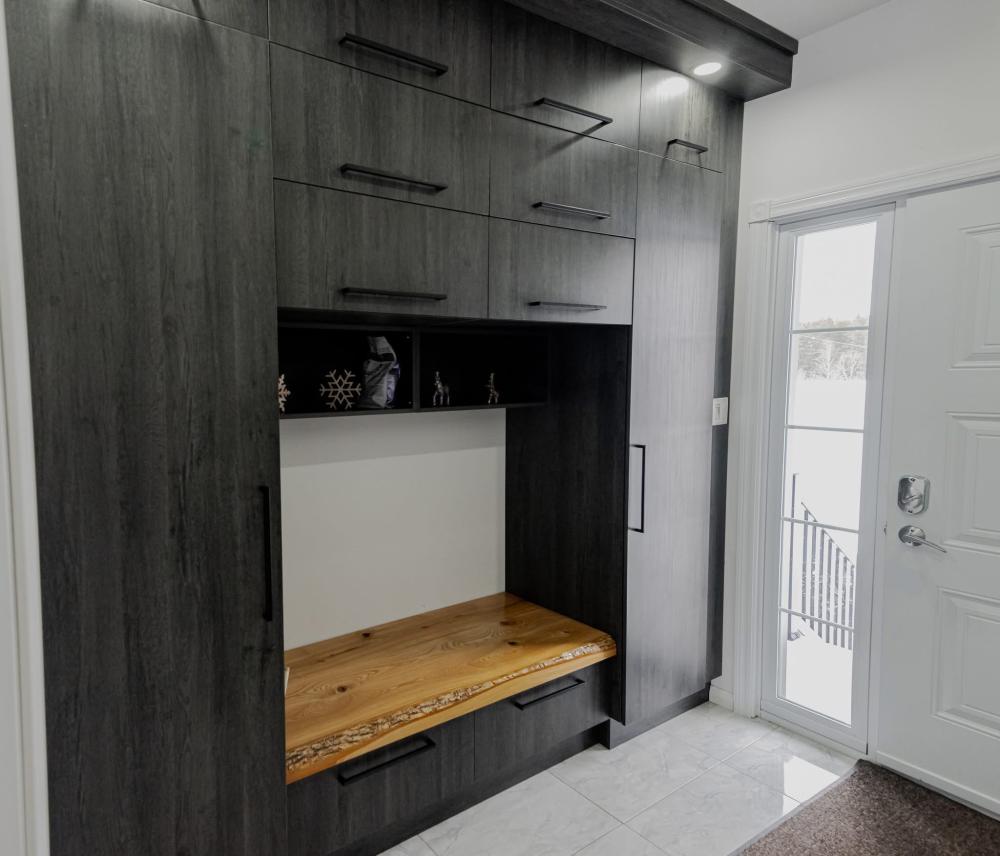 Conception, fabrication et installation complète de vos armoires, îlots, rangements et finitions.