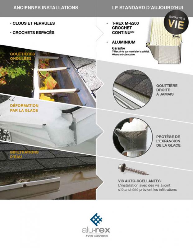 Nous utilisons les crochets continus T-Rex, un investissement peu couteux qui augmentera la durée de vie de vos gouttières. Elles qui sont normalement abimées par les chutes de neige et l’expansion de la glace à l'intérieur de la gouttière. Vous aurez également beaucoup moins d'entretien à faire faire mais surtout, vos gouttières resteront fonctionnelles évitant ainsi les infiltrations d'eau vers le toit et les fondations.