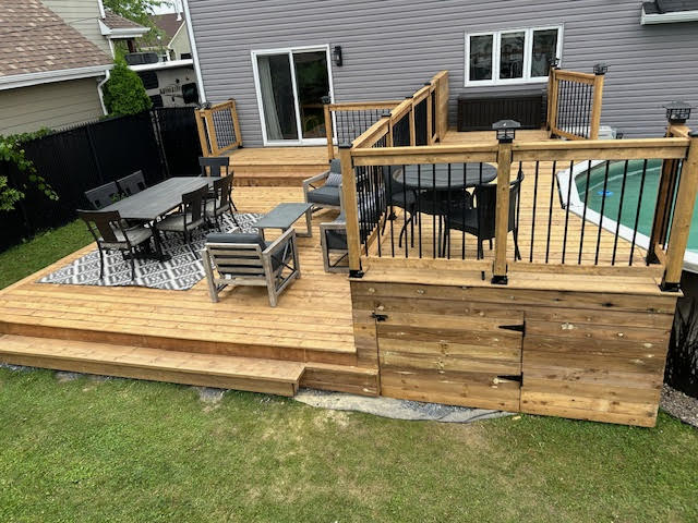 Patios en bois et aménagements extérieurs : conception et construction de patios solides et esthétiques, ainsi que de pergolas, gazebos, balcons et terrasses surélevées.